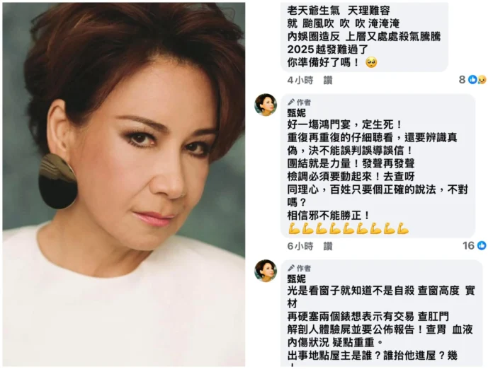 正是在中共升級打壓輿論的背景下,香港歌后甄妮於9月22日在臉書發文,以灰底白字寫下「荒謬世代 自取滅亡」,怒轟大陸娛樂圈如「魷魚遊戲」真人版,直言「資方最惡毒,出錢玩S你」。她悲觀表示,雖然案件看來並不複雜,就是「合夥謀害一個不服從的孩子」,但真相恐難大白。甄妮感慨在「變態的制度」之下,何來真相與正義,難以想像潛規則已敗壞到如此境地,讓她既無奈又痛心。她還聯想到此前李玟生前遭大陸電視台欺凌的事件,憤慨指出:「大陸不辦就是沒天理!國際大笑話!」甄妮的發聲,不僅為于朦朧的死帶來了更廣泛的關注,也將事件提升到對整個大陸娛樂圈生態乃至制度層面的批判。