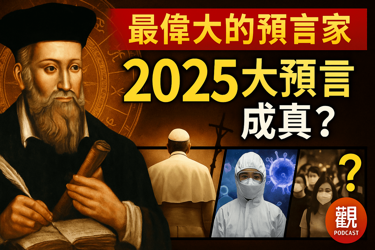 2025年復活節,羅馬教宗方濟各辭世,舉世哀悼。與此同時,數百年前諾查丹瑪斯對「年邁教皇之死」及天主教會衰落的預言再度浮現。新瘟疫於中國大陸蔓延,神秘天象與戰爭傳言並起,醫學突破與人類存亡的抉擇之間,預言與現實交織,宛如「末日時鐘」再度撥近。我們究竟能從諾查丹瑪斯的預言和現實世界的災變中,看見怎樣的警示與啟示?
